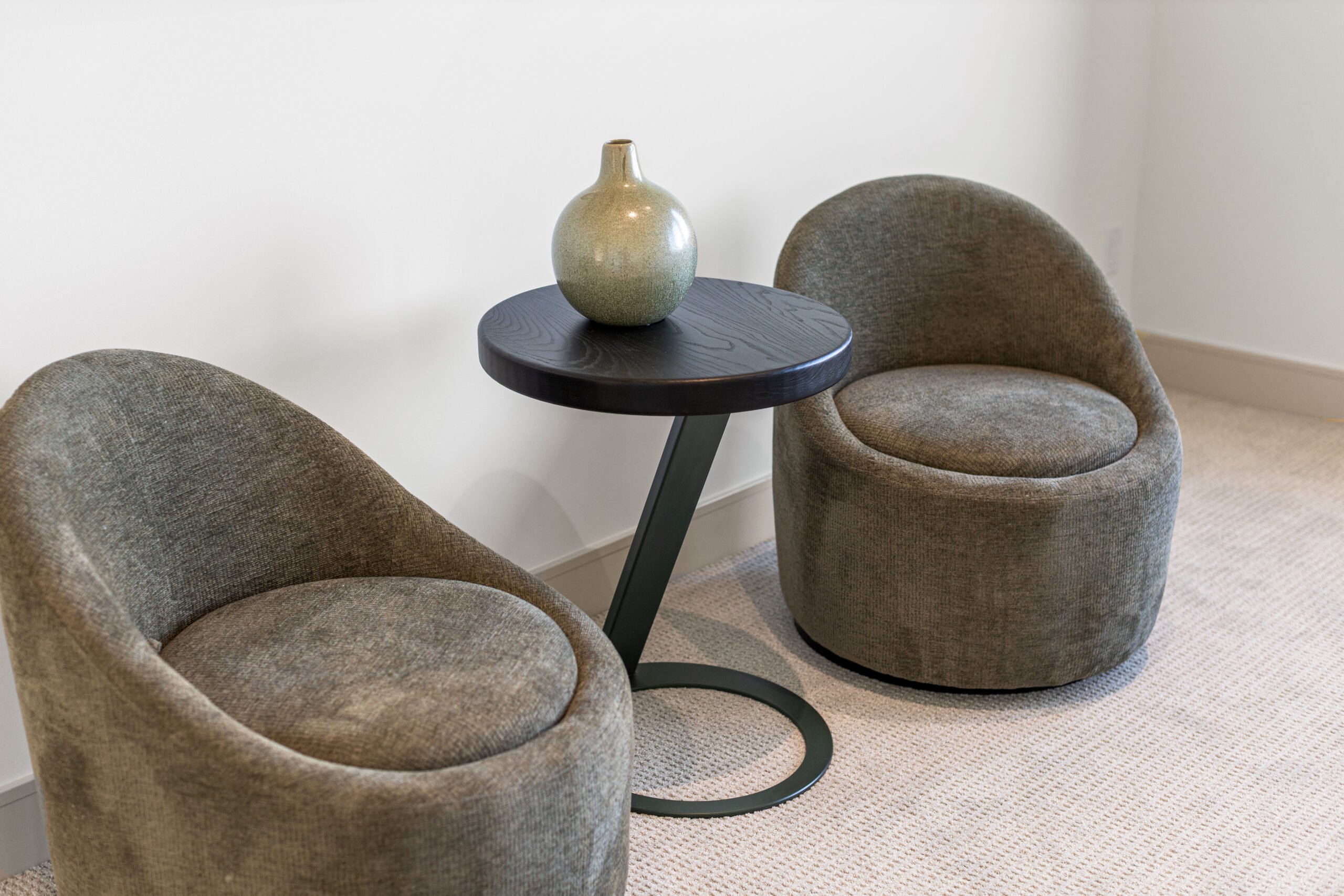 These are a pair of solid white ash table tops, stained a deep black. And we chose to make the bases not quite identical, but still complementary of each other.